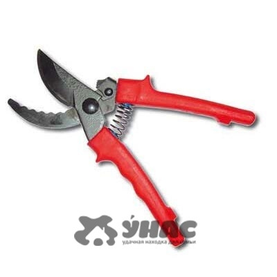 Секатор одностороннего резания. Секаторы различаются построением режущей системы: у инструмента одностороннего резания - одно лезвие, как правило, верхнее, совмещённое с упорной пластиной или наковаленкой. Предназначены для формирования и обрезки крон плодовых деревьев и кустарников. Это садовые ножницы с кривыми стальными режущими лезвиями. Между армированными пластмассой ручками помещена спирально-пластинчатая пружина для автоматического раствора ножниц. Оксидированное покрытие. Длина: 220 мм