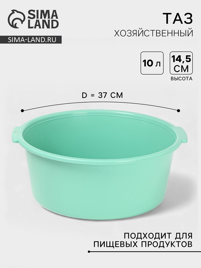Пластиковый хозяйственный таз круглой формы объемом 10 литров в свежем мятном цвете. Универсальная емкость для бытовых нужд с оптимальными размерами 37×35×14.5 см. Идеальное решение для стирки, уборки и других домашних задач.