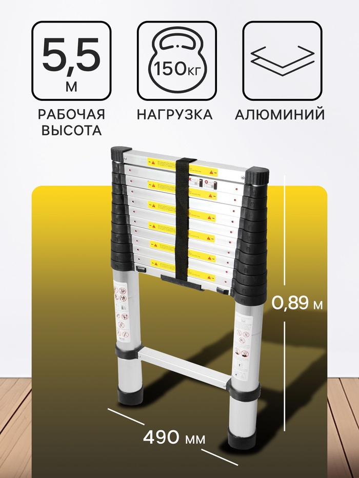 Лестница достаточно лёгкая, ведь изготовлена из алюминия. А для удобного хранения в комплекте идёт ремешок на липучке для фиксации.