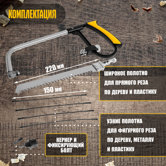 Набор с ножовкой ТУНДРА — это комплект инструментов, предназначенный для различных видов пиления и работы с металлом. Он включает в себя ножовку, универсальную пилку и 5 пилок по металлу.
