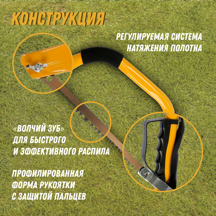 * Натяжная система лучковой конструкции: Позволяет регулировать натяжение полотна для точного реза. Рама обеспечивает стабильность геометрии durante работы.