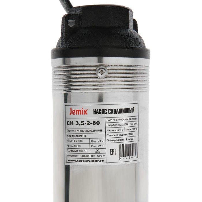 Насос скважинный JEMIX СН 3.5-2-80, центробежный, 900 Вт, напор 93 м, 75 л/мин, кабель 2 м