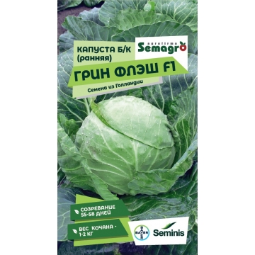 Грин Флэш F1 HN,продаваемый в фирменной упаковке компании Асгроу (Asgrow) - очень ранний гибрид белокочанной капусты для употребления в свежем виде. Созревание очень раннее, в среднем через 55-58 дней после пересадки. Форма кочана - округлая. Кочаны среднего размера, компактные, темно-зеленого цвета с чуть голубым оттенком. Средний вес кочана 1.0 - 1.5 кг, в зависимости от условий выращивания и плотности посадки. Внутренние листья желтой окраски имеют превосходные вкусовые качества. Грин флэш F1 прекрасно сохраняется на корню, т.к. имеет устойчивость к растрескиванию. Благодаря компактным кочанам и толерантности к растрескиванию, Грин Флэш F1 прекрасно подходит для транспортировки на дальние расстояния. Великолепный гибрид ранней капусты также отличается толерантностью к условиям выращивания в повышенных температурах (жаростойкостью).