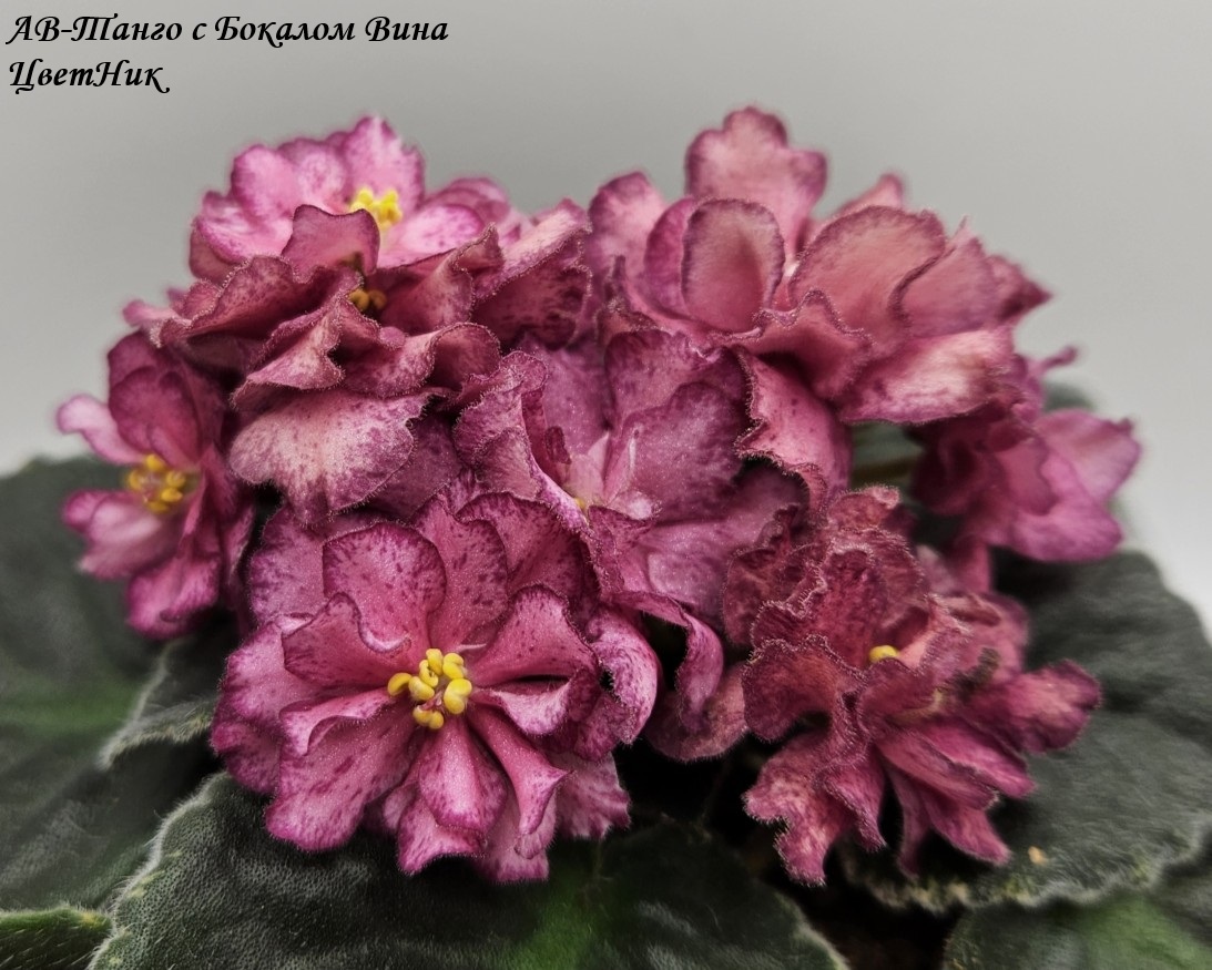 Цветок: Полумахровые и махровые волнистые розовые звезды с темно-малиновым фантазийным краем.