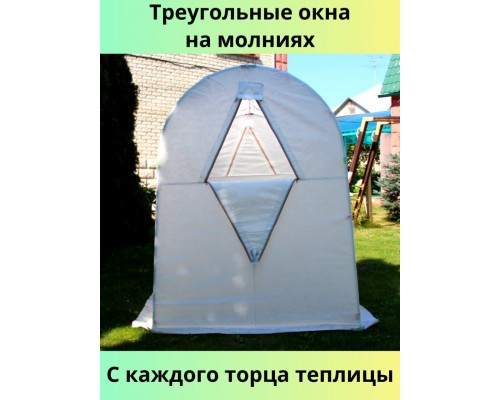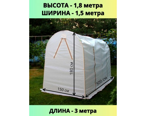 Высота каркаса парника составляет 1,8 метра, длина каждой дуги — более 3 метров, всего 4,4 метра. Длина теплицы — 3 метра, ширина — 1,5 метра. Внутри легко помещается грядка размером 3х1 метр или 3х1,5 метра, что позволяет удобно обслуживать растения.
