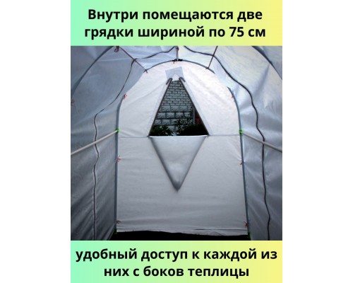 Чехол парника имеет четыре боковых двери на молниях, расположенных вдоль всей длины парника на каждой его стороне. Каркас изготовлен из металлической трубы диаметром 20 х 1,2 мм в пластиковой оболочке. Между дугами парника на высоте 1,8 метра расположена стальная перемычка, которая служит высокой металлической шпалерой для огурцов. К ней можно прикрепить шпалерную сетку, по которой будут виться растения.