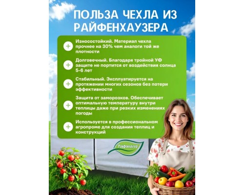 Мы профессионально занимаемся чехлами для теплиц уже более 15 лет. Путем проб и ошибок нашли самый подходящий материал, который с одной стороны формирует комфортный микроклимат внутри теплицы, обеспечивая высокую урожайность, с другой - является практичным и в меру износостойким материалом. Это нетканное полотно марки Райфенхаузер SSS-80. Мы все уже исптытали за Вас. Просто пользуйтесь с удовольствием. Под чехлом из Райфенхаузера растения не преют, не обгорают, и максимально раскрывают потенциал, заложенный в них природой. Служит такой чехол до 5 лет, по мере износа меняется на запасной, которые всегда есть у нас в наличии и стоят недорого.