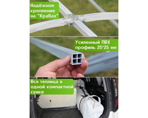 Весь комплект теплицы каркас, чехол, крепеж - все упаковано в одну сумку, которую вы можете привезти на дачу в легковом автомобиле. Вы экономите на доставке этой теплицы на дачу. Не надо нанимать грузовую машину для доставки.