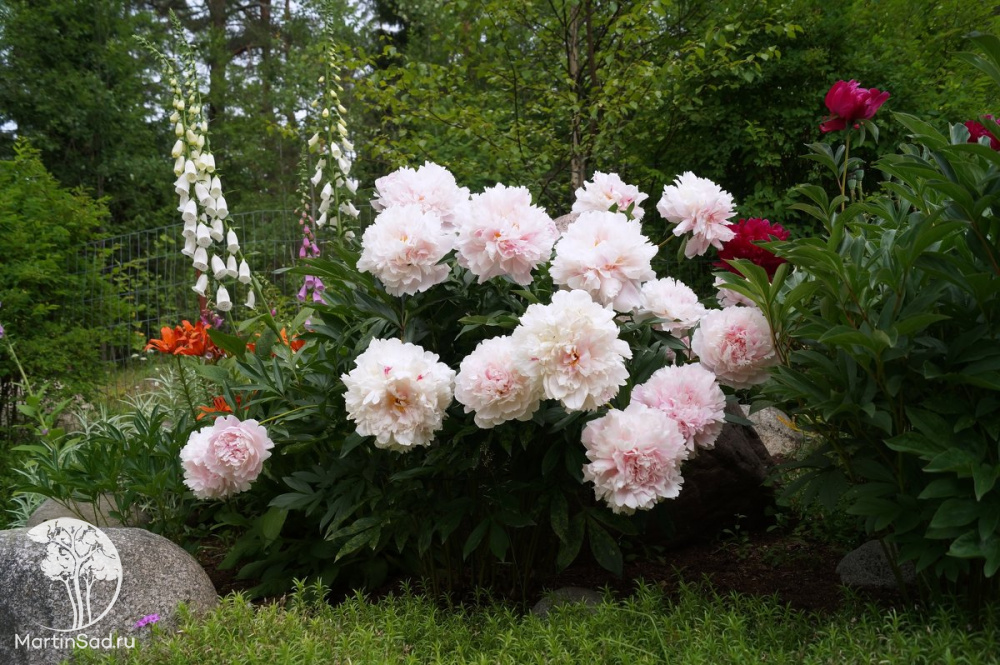 Травянистый. Сорт внутривидовой от p. lactiflora. Махровый розовидный. Светло ― розовый. Есть тычинки. Пестики отсутствуют. Стебли прочные. Диаметр цветка 17 см. Высота растения 70 см. Средний срок цветения.
