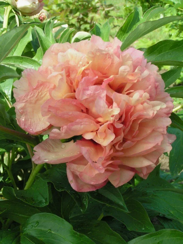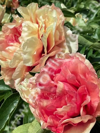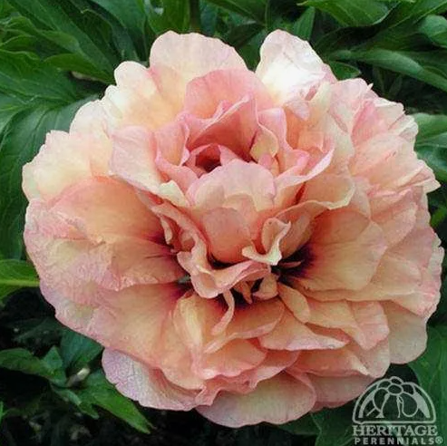 Ито-гибрид. Цветок очень крупный, диаметром 20 см, махровый, смешанных красивых пастельных тонов: светло-жёлтых, розовых и абрикосовых, с тёмно-розовой серединкой. Листва тёмно-зелёная. Высота 60 см. Срок цветения средний.