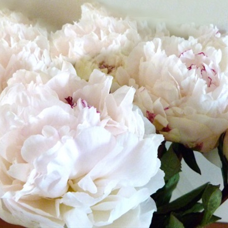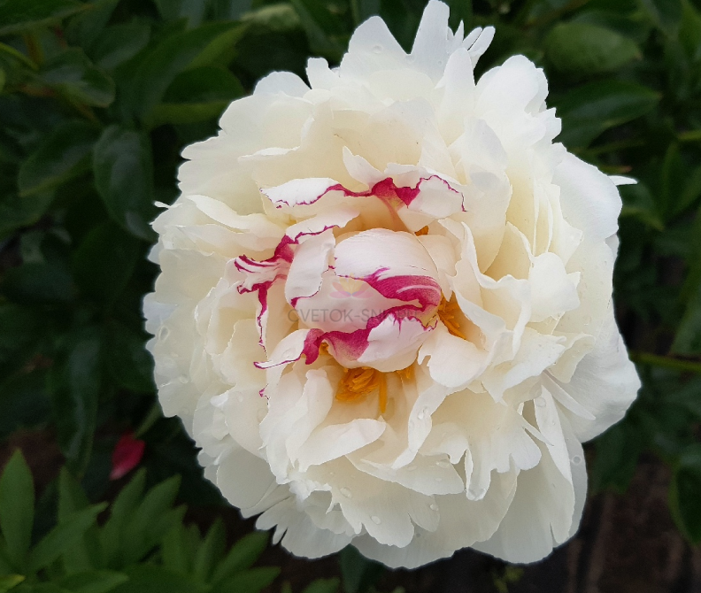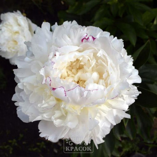 Пион 'Evening Star' - махровый, розовидный, позднего срока цветения. Пион Lactiflora с крупными идеально сформированными цветками. Цвет богатый, живой светящийся белый с иногда малиновой окантовкой соцветий, средняя высота 85 см, здоровая зеленая листва.