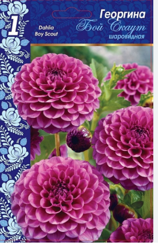 Георгина Бой Скаут — клубневое растение высотой 100–110 см. Шаровидные фиолетово-розовые цветки достигают 20 см в диаметре и служат замечательным украшением участка. Агротехника. Клубни георгин рекомендовано высаживать на солнечные, защищенные от холодных ветров места с хорошей циркуляцией воздуха. Подходит любая плодородная почва, хорошо дренированная и с нейтральной кислотностью. Нежелательно высаживать в низине, вблизи залегания грунтовых вод и в затененных местах. Посадочную яму копать глубиной 10–15 см. При посадке корневая шейка должна находиться на 2–3 см ниже уровня почвы. Георгины сажают на расстоянии 60–70 см друг от друга. В сухую погоду и в течение вегетации требуется обильный полив. Подкармливать следует несколько раз за лето, чередуя растворы органических и минеральных удобрений. Первую подкормку проводить через 10–14 дней после посадки, вторую — во время бутонизации, а третью — в период цветения. С наступлением первых заморозков георгины выкопать, стебли обрезать на высоту 10–15 см. Клубни промыть и просушить, затем уложить в ящики с торфом или песком на хранение. Оптимальная температура при хранении должна быть +5…+7 °С.