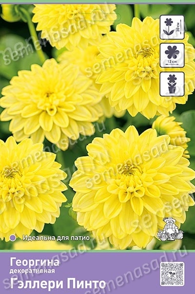 Гэллери Пинто - куст компактный, высотой 25-30 см. Прекрасно подходит для оформления переднего плана цветника, бордюрных линий, а также выращивания в горшках. Цветы - пышные корзинки диаметром 12 см, яркой лимонно-жёлтой окраски. На одном кусте за сезон образуется до 25-ти бутонов. Цветение обильное и продолжительное. Не нуждается в подвязке и удалении боковых побегов.
