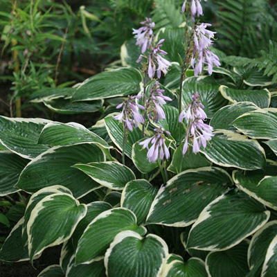 листья темно-зеленые с белым краем,цветки фиолетовые, выдерживает яркое солнце