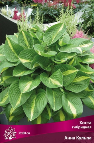 округлые текстурные листья с широкой сине-зеленой каймой и светло-зеленым центром, познее приобретает золотистый оттенок, цветы почти белые