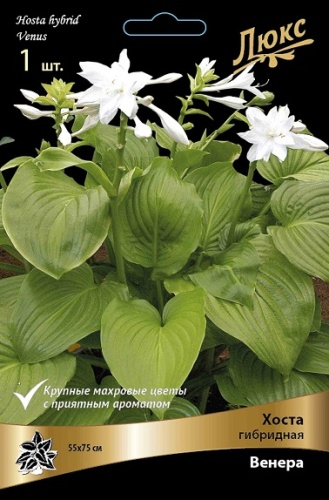 гигантская хоста, крупные белестящие сердцевидные зеленые листья с кремово-желтым краем, позже кант становится почти белым, цветки почти белые