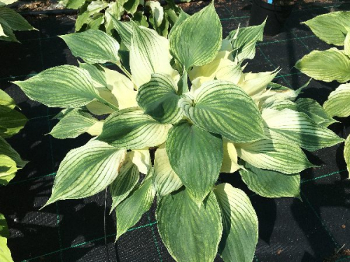 полосатая хоста с вертикальной формой роста, лист удлиненный с частыми желтыми полосами, к середине лета хоста зеленеет Н-35см Ø 50см