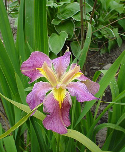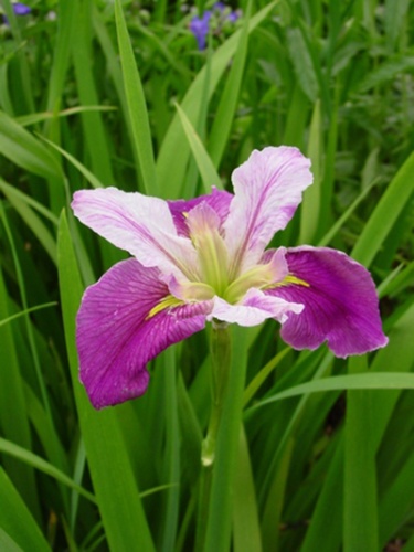 Нижние лепестки пурпурные, верхние - белые с тонкими пурпурными полосками
