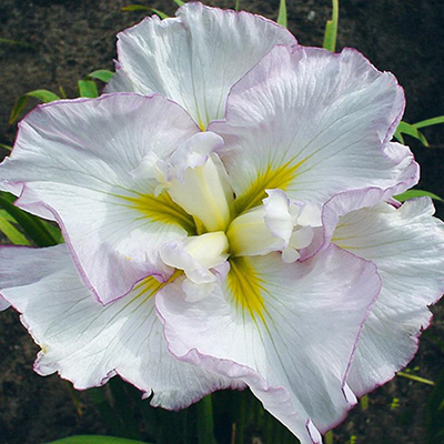 Белый с нежнейшей дымчато-розовой каймой и ярко-розовым кантом по краю лепестков. Ткани лепестков тонкие, полупрозрачные