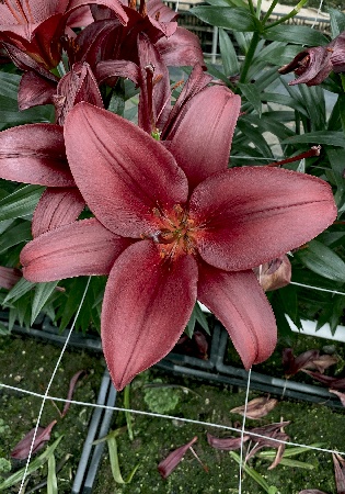 темно-красный, насыщенный с темным напылением по краю лепестков, легкий аромат, H-110см