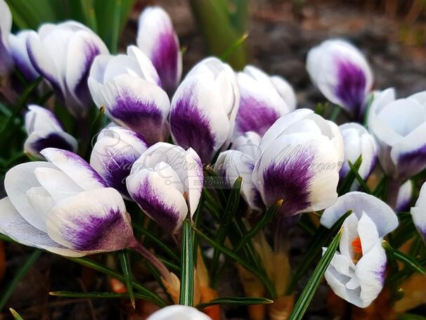 Крокус «Принц Клаус» - неподражаемый в своей красоте сорт многолетних луковичных. Растение уникально тем, что зависимо от погоды меняется окраска цветка. Секрет в том, что на внешней стороне лепестков присутствуют широкие фиолетовые полосы, а внутренняя их часть – абсолютно белая. В солнечные дни полностью раскрытые цветки белоснежные, а в пасмурную – фиолетово-белые.