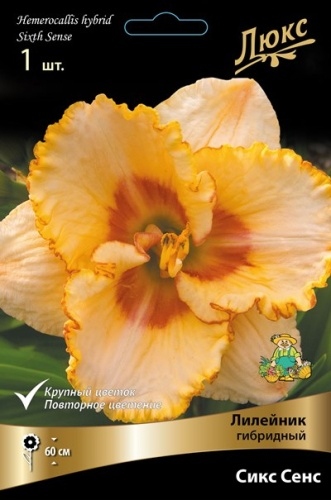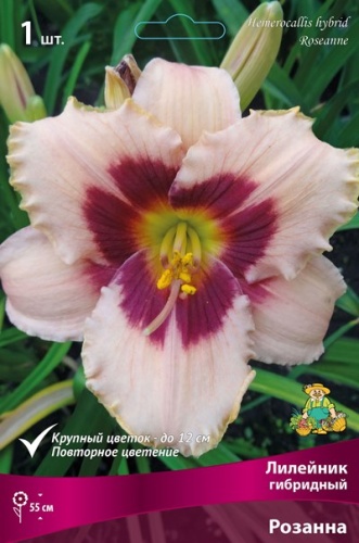 кремово-розовый с темно-розовым центром, горло желто-зеленое, лепестки по краям гофрированны, повторный, диаметр цветка 12 см.