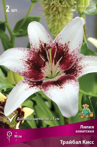 белый с густыми вишневыми крапинками до середины, по центру лепестков светло-желтые лучи, диаметр цветка до 15 см
