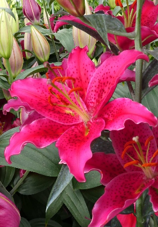 темно-красный с тонким белым кантом и частым темным крапом, легкая волнистость по краю лепестка, 20см, H-110см