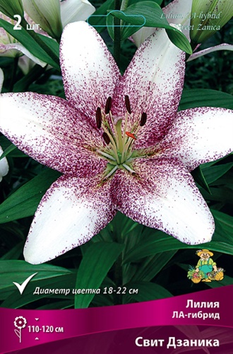 КРУПНЫЙ, белый с густым бордовым крапом у центра и по краям лепестков, диаметр цветка 18-22 см