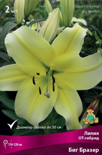 ОЧЕНЬ КРУПНЫЙ, нежно-желтый с коричневыми пыльниками, у центра более насыщенный желтый, диаметр цветка 30 см