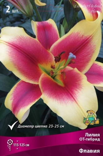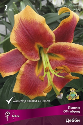 абрикосово-желтый с темно-красно-оранжевым пятном до середины лепестков, диаметр цветка 16-18 см
