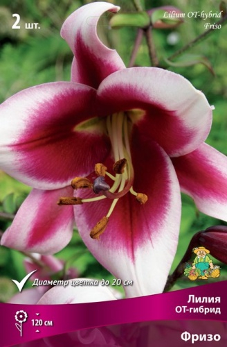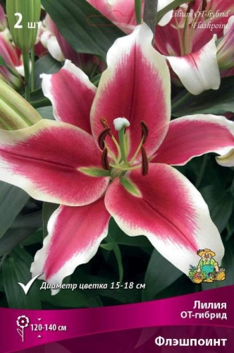 темно-розово-винный с кремово-белой каймой и желто-зеленой "звездочкой" в центре, кончики лепестков широкие, волнистые, диаметр цветка 15-18 см