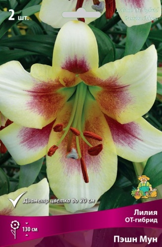 КРУПНЫЙ, кремово-белый со светло-желтым кантом, бордовыми пыльниками и мазками от центра, диаметр цветка 20 см