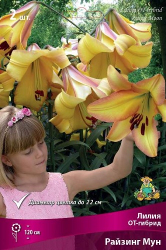КРУПНЫЙ, желтый с палево-розовой каймой и темными пыльниками, диаметр цветка 22 см