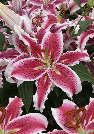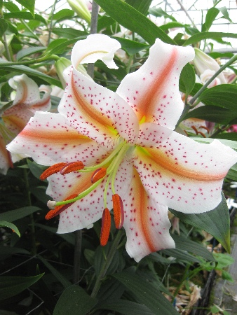 белый с оранжево-желтыми полосками по центру лепестков и пурпурным частым крапом, H-130см