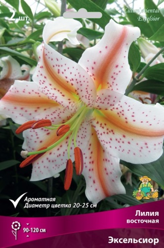 КРУПНЫЙ, белый с оранжево-розовыми продольными полосами и крапом почти по всей поверхности лепестков, диаметр цветка 20 см