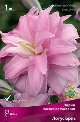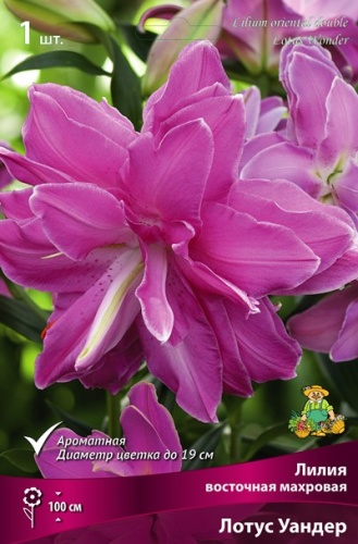 лилово-розовый с тонкой белой каймой, форма лотоса с эффектным сложением лепестков, диаметр цветка 19 см