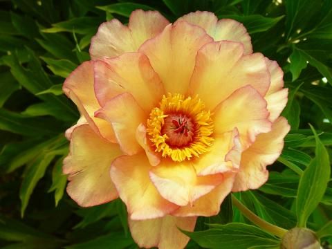 ИТО-Гибрид. Цветок полумахровый, в начале цветения его оттенки персиковые, розовые и оранжевые. В дальнейшем светлеет до кремово-желтого, а края остаются первоначальных оттенков длительное время. Стебли прочные, роскошная листва. Высота куста около 65 см. Срок цветения средний. Шикарный пион, еще довольно редкий!