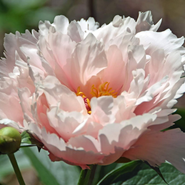 Paeonia 'Nelda's Joy - ранне-средний пион, гибрид. Форма меняется от полумохровой до махровой, лепестки светло-розового оттенка, цветки диаметром 18 см, форма цветка редккая словно цветок в цветке. Наружние лепесткии крупные округлые, внешние лепестки с резными краями, рваные не ровные, что придает удивительную элегантность и дизайн этому сорту. Обладает приятным ароматом.