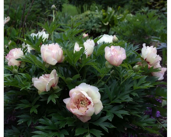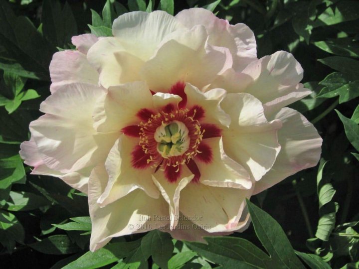 Гибрид пиона Пастель Сплендор украшают цветы нежного пастельного окраса с присутствием элементов белого и бледно кремового цвета. Средние лепестки имеют более насыщенный розовый оттенок, середина заполнена золотисто-желтыми тычинками. Немахровый крупный цветок, размером до 20 см, имеет форму чаши. Сорт относится к древовидным пионам, стебли прочные прямые, листья резные, ажурные. Высота куста около метра. Благодаря пышной зелени листьев не теряет привлекательности в течение всего теплого периода.