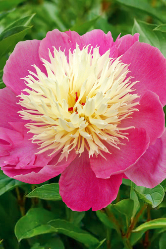 Особый полумахровый пион, с исключительными цветами. Он окрашен в темно-красный, черно-красный цвет. Бутон пяти-шести рядный, с крупными желтыми тычинками, которые подсвечивают его изнутри. Листья темно-зеленые. Куст невысокий, компактный. Стебли прямые, прочные. Сорт подходит для срезки.