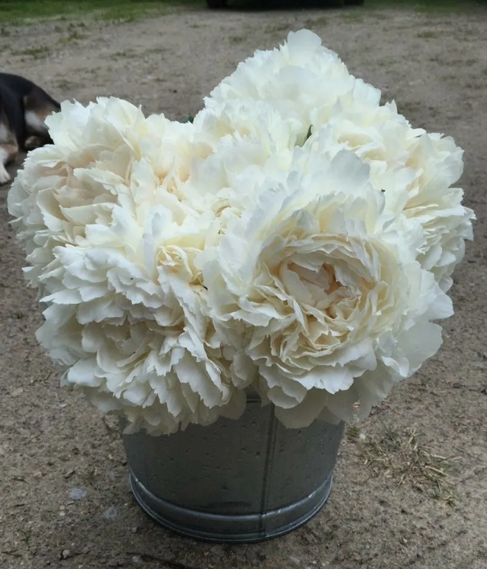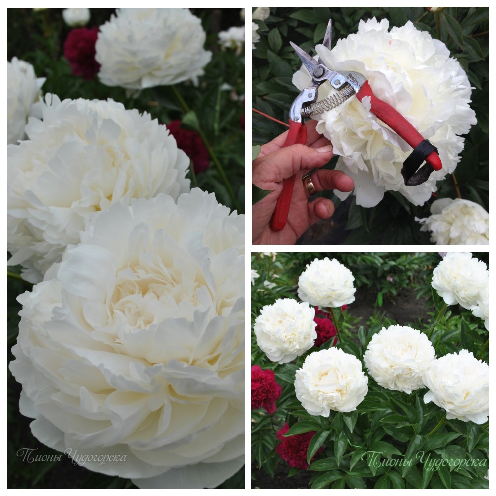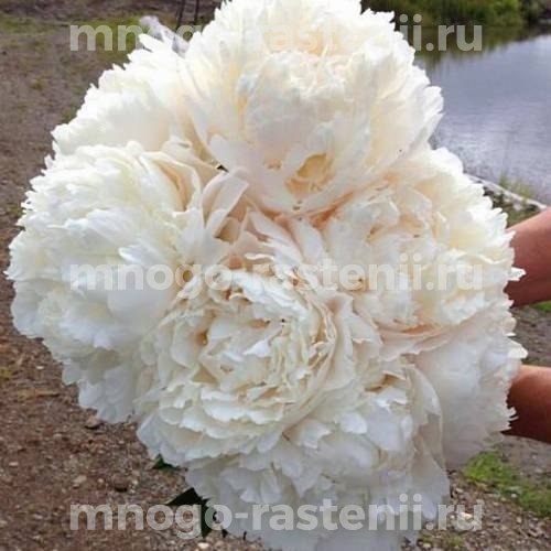 Абсолютно белый. Сильно махровый набивной пион. Большие цветки симметрично сложены из одинаковых лепестков, закручивающихся к центру, тем самым образуя плотную белую шапку. Один из лучших белых сортов.