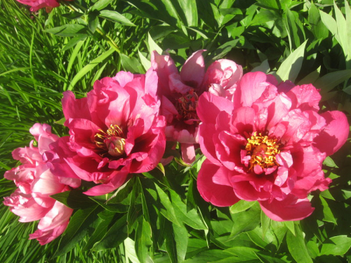 Пион ИТО Pink Ardour (Пинк Одор). Достаточно редкий сорт. Цветки очень яркие, розовые (с оттенками розы и малины), крупные, до 20 см в диаметре, полумахровые. Тычинки золотистые, многочисленные. По мере цветения лепестки по краям темнеют. Обладает приятным ароматом.