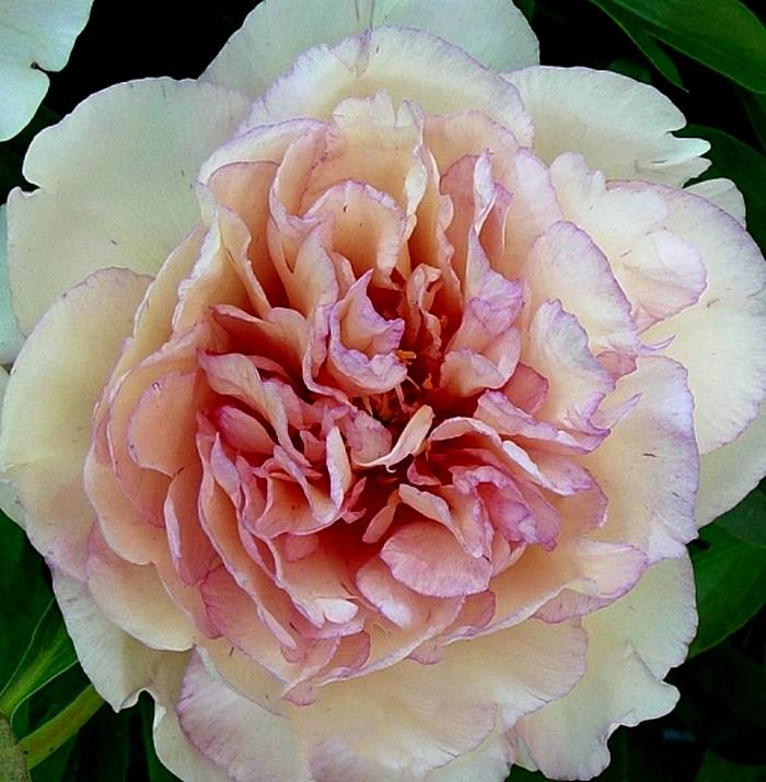 Scrumdidleumptious — ито-гибрид с уникальной окраской лепестков: от светло-розового до сливочного с переходами и румяными краями, диаметром до 15см. Цветки махровые, чашевидные, обладают легким ароматом и появляются на крепких побегах. Цветение обильное и продолжительное.