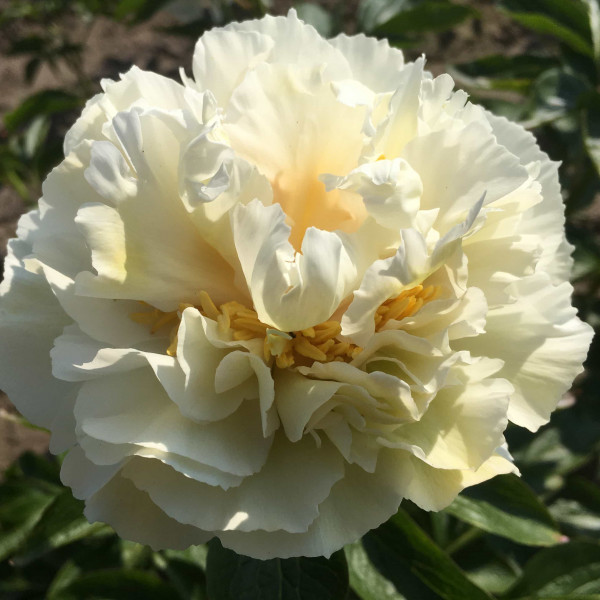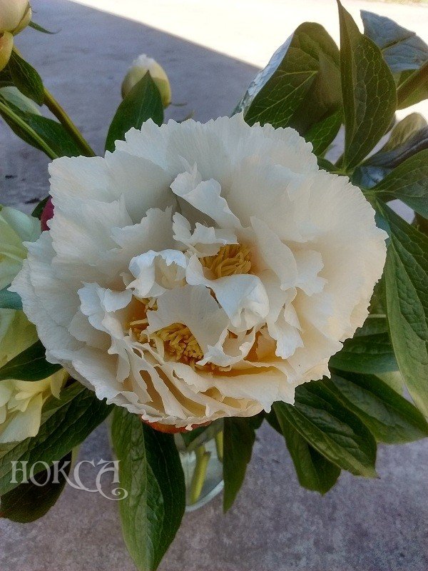 Пион 'Grand Massive' - ранний полумахровый белый гибрид, обладает эффектными белыми чашевидными цветами с зелено-желтыми вкраплениями, с зазубренными краями по кромке лепестков, в центре чаши желтые тычинки и бело-желтые плодолистики с розовыми рыльцами. Высокорослый гибрид 85 см. Впервые зацвел в 2001 г., имеет большой потенциал для выращивания срезанных цветов,