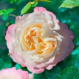 Бутоны кремового цвета с розово-фиолетовыми полосками раскрываются в пышные махровые кремовые цветки (от 41 до 56 лепестков). По краям лепестки окрашены в розовый оттенок. Ароматные цветы собраны в изящные соцветия, которые эффектно смотрятся на фоне тёмных матовых листьев.