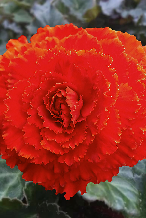 Элегантная бахромчатая бегония, с нежными темно-зелеными ажурными листьями. Цветки крупные, окрашены в карминно-красные, алые оттенки. Лепестки сильно гофрированные, с резными кончиками. Сорт станет прекрасным украшением как для дома, так и для сада.