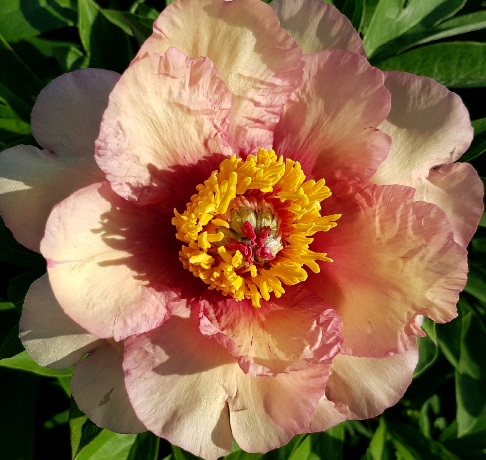 Пион 'Sonoma Welcome' - 2-3х рядный пион желтого цвета. В начале роспуска абрикосовый и в процессе раскрытия меняет цвет до желтого с незаметными светло-красными бликами. Много цветов, отличная листва. (Irene Tolomeo, США, 1999).