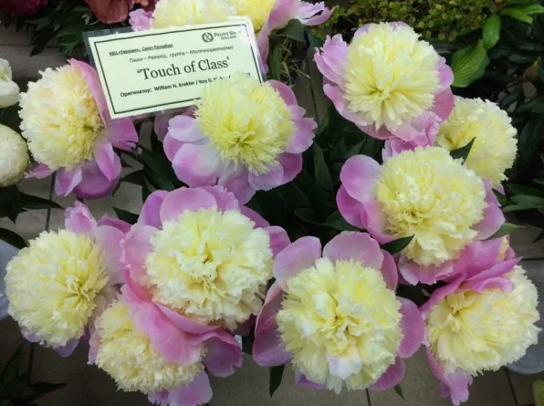 Японского типа. Цветок диаметром 15 см, красивой формы. Два ряда наружных светло-лососёво-розовых лепестков держат плотный центр из красиво уложенных кремово-жёлтых петалодий, которые затем становятся кремово-лососёвыми. Тычинок и пестиков нет. На стебле по 4 бутона. Высота 90 см. Срок цветения средний.