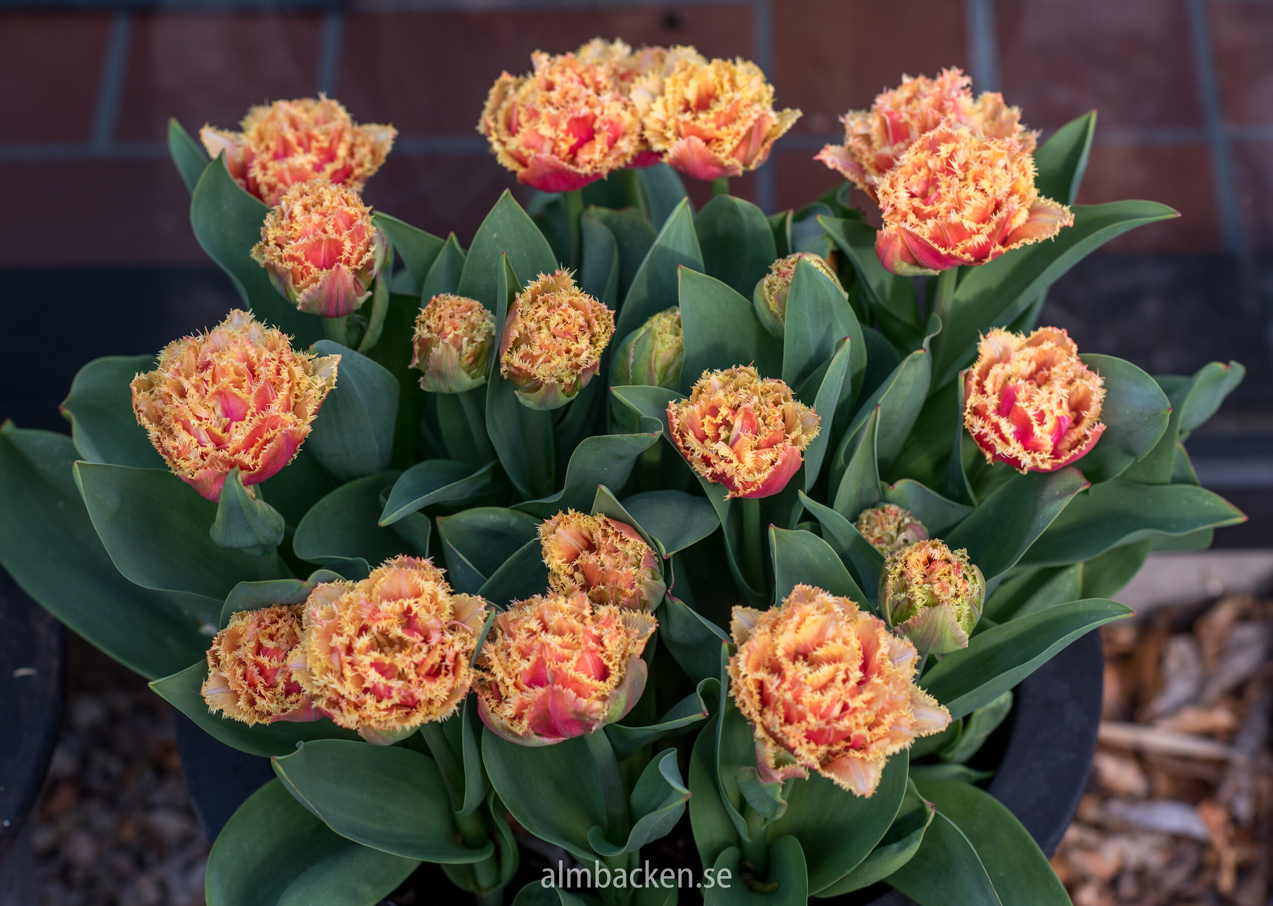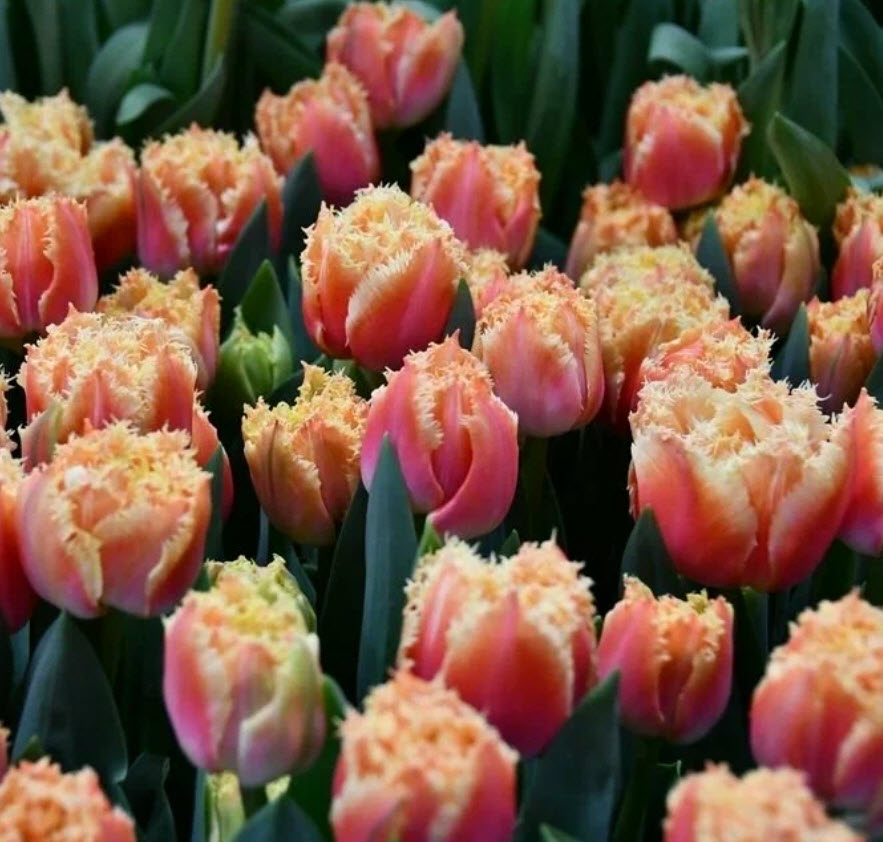 Отличительная особенность бахромчатых тюльпанов - игольчатая бахрома по краям лепестков, напоминающая иней. Эффектное смешение оттенков оранжевого, персикового и розового в обрамлении густой бахромы, напоминающей иней! Сорт идеален для выращивания в открытом грунте и контейнерах. Высота: 40-45 см